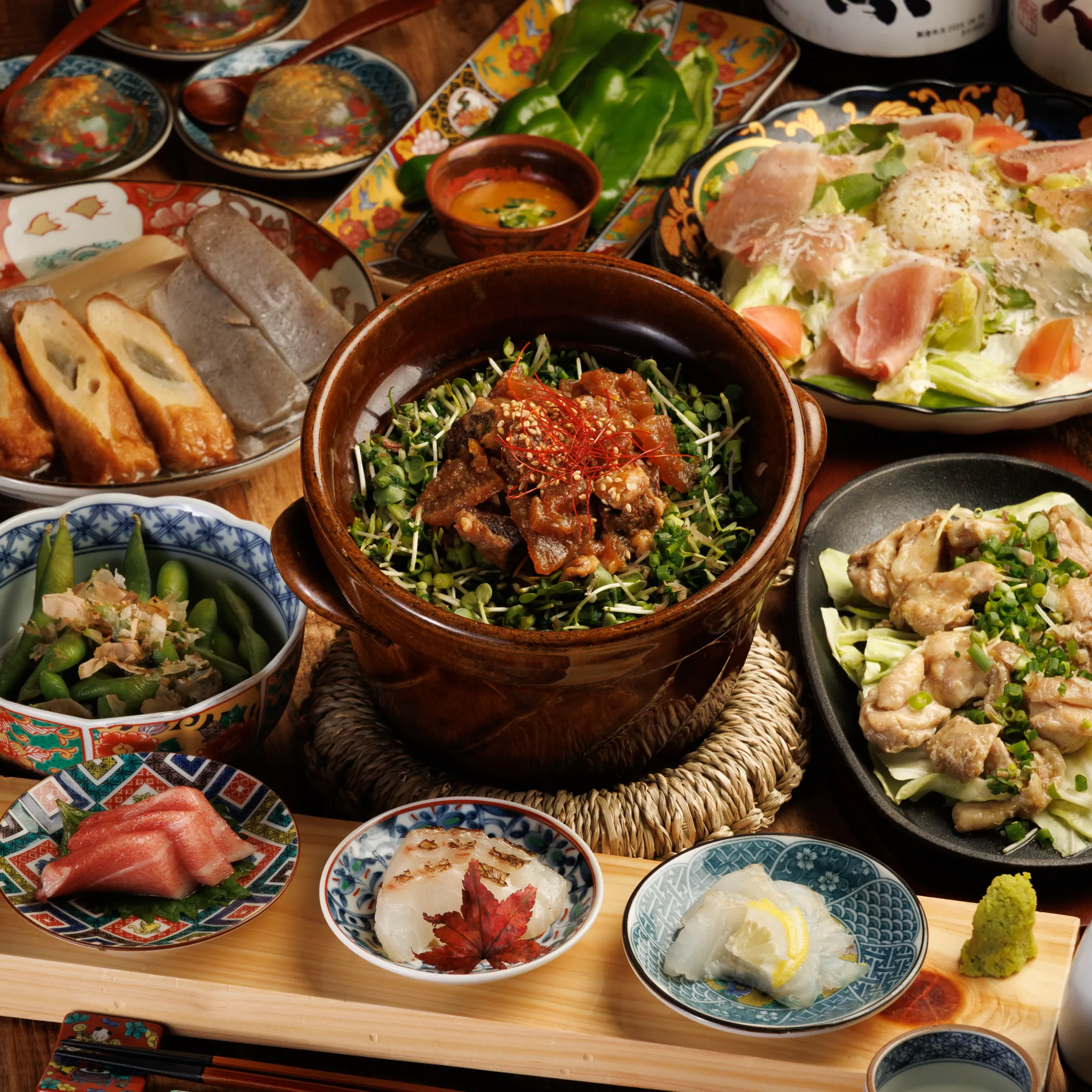 九条ネギのモツ鍋と季節の味覚を贅沢に楽しめる冬限定コースです。 日本酒10種・ビール・ハイボールなどを含む2時間飲み放題付きの豪華プランです。